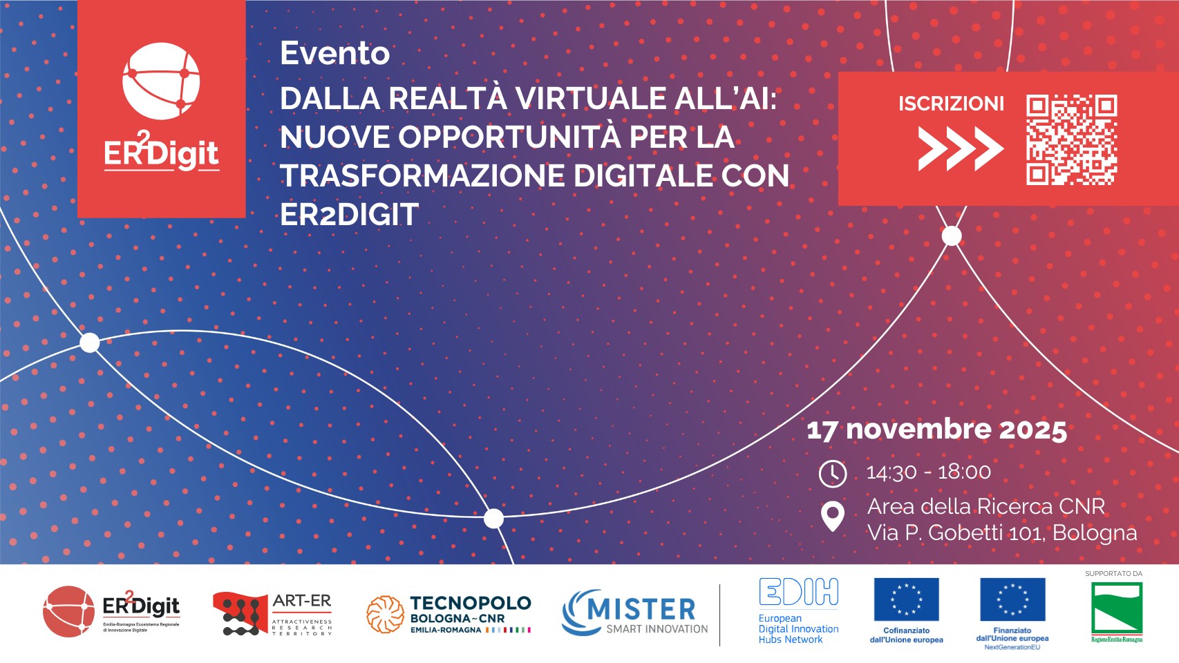 Sei una startup, una PMI o un centro di ricerca che sviluppa soluzioni innovative? Unisciti a noi all'evento “Dalla realtà virtuale all’AI: nuove opportunità per la trasformazione digitale con ER2Digit”, in programma lunedì 17 novembre 2025 alle ore 14:30 presso l’Area di Ricerca di Bologna...